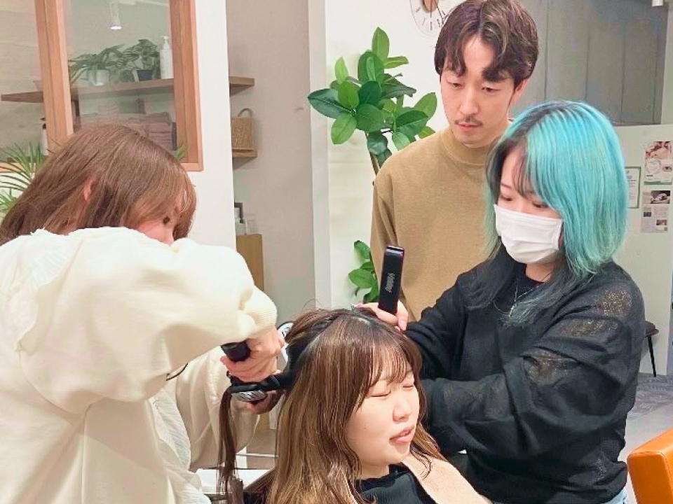 2年でスタイリストデビュー出来るカリキュラム。『学びたい』気持ちを応援!デビュー後には、着付、アイ、ネイル、エステなど、新しい技術にも挑戦できます。自分がなりたい美容師へ、トータルビューティーサロンだからこそ、何刀流にもなれる!そんな環境が整っています。